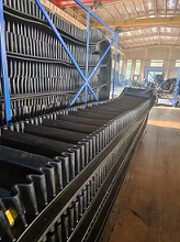 基带的构造:基带是由上覆盖胶、下覆盖胶、带芯和横向刚性层四部分组成。上覆盖胶厚度一般为3-6mm;下覆盖胶厚度一般为1.5-4.5mm,带芯材料承受拉力,其材料可以是棉帆布(CC)、尼龙帆布(NN)、聚酯帆布(EP)或刚绳芯(ST)。为了增加基带的横行刚性,在芯体上、上假如特殊加强层,称横向刚性层。基带的宽度规格,与普通胶带相同波形挡边输送带被广泛引用与港口、冶金、矿山、电力、煤炭、铸造、建材、粮食