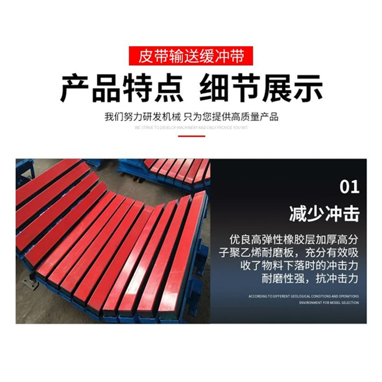 我厂缓冲条特点:我厂缓冲条解决了现有国产缓冲条产品中易起泡分层、脱层、纵向易撕裂,输送带运行中缓冲条来回窜动的问题,是一种抗磨损、抗冲击防纵向撕裂的缓冲条。