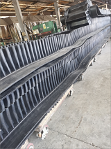 大倾角挡边运输带由基带、挡边、横隔板三部分组成。挡边起防止物料测滑撒落的作用。橡胶皮带当中大倾角挡边带是橡胶输送带当中技术含量非常高的一种特殊产品,而它的隔板部分对于硬度、磨耗、挺性等指标要求非常高大倾角挡边带隔板,其具有高硬度、耐磨、表面光滑不粘物料,使用寿命长的优点。